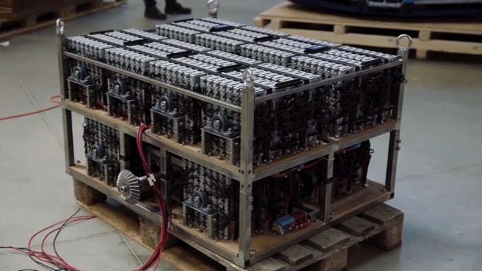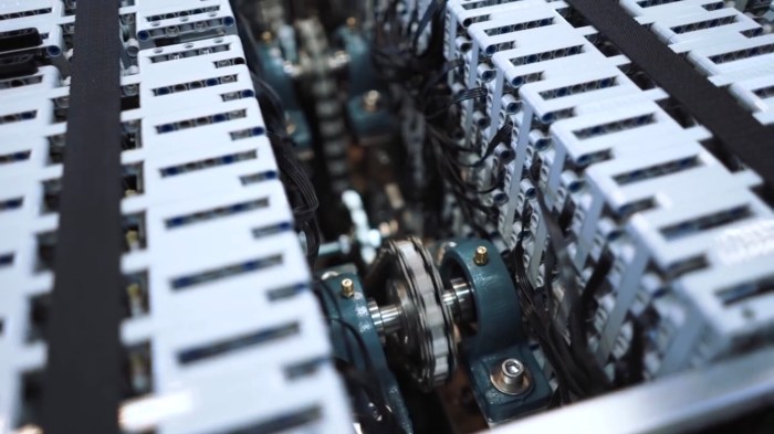 The electric motor drive consists of multiple modules that each contain a 7 by 7 matrix of standard LEGO Technic motors which are then assembled together and geared to a chain drive that spins an output shaft and ultimately the tires.