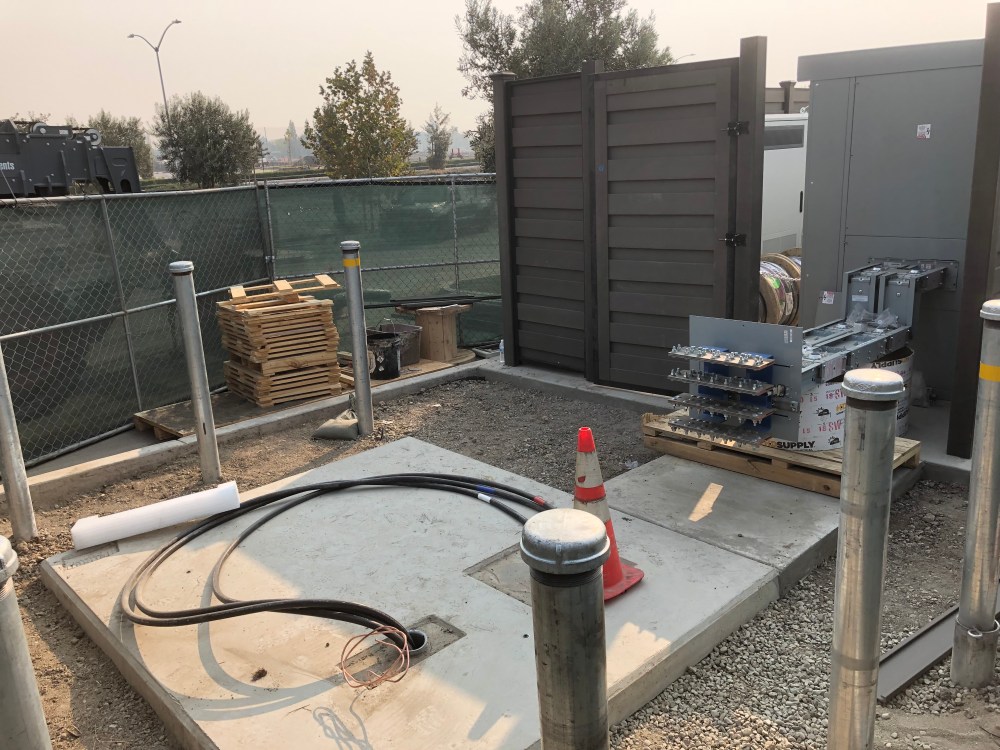 ‘IMG_9181’ Published November 13, 2018 at 4032 × 3024 in Tesla, Electrify America adjacent DC charging sites near completion in Livermore Electrify America utility transformer pad ‹ Back