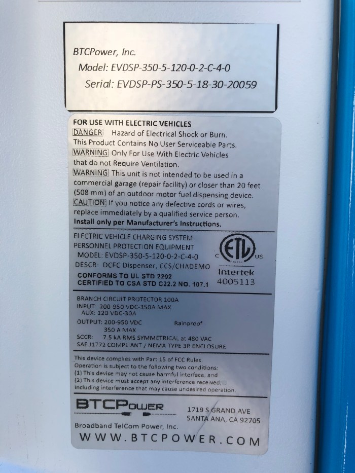The 200 kW BTC Power chargers being used by Recargo appear to be closely related to the BTC Power unit being used by Electrify America for their first community DC charging locations which were recently opened in Elk Grove and Torrance in California. The charging cabinet contains four “power engines” which can each output up to 50 kW.