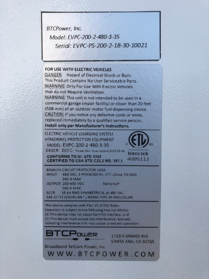 The specification label on the Prunedale charger cabinets.