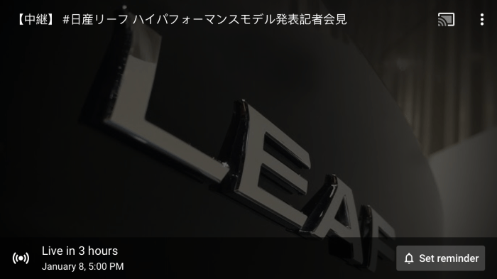 The time is apparently set for 5pm Pacific, although clicking the link to the video indicates the stream could start a bit earlier. The text running along the top of the YouTube window says “【中継】#日産リーフハイパフォーマンスモデル発表記者会見